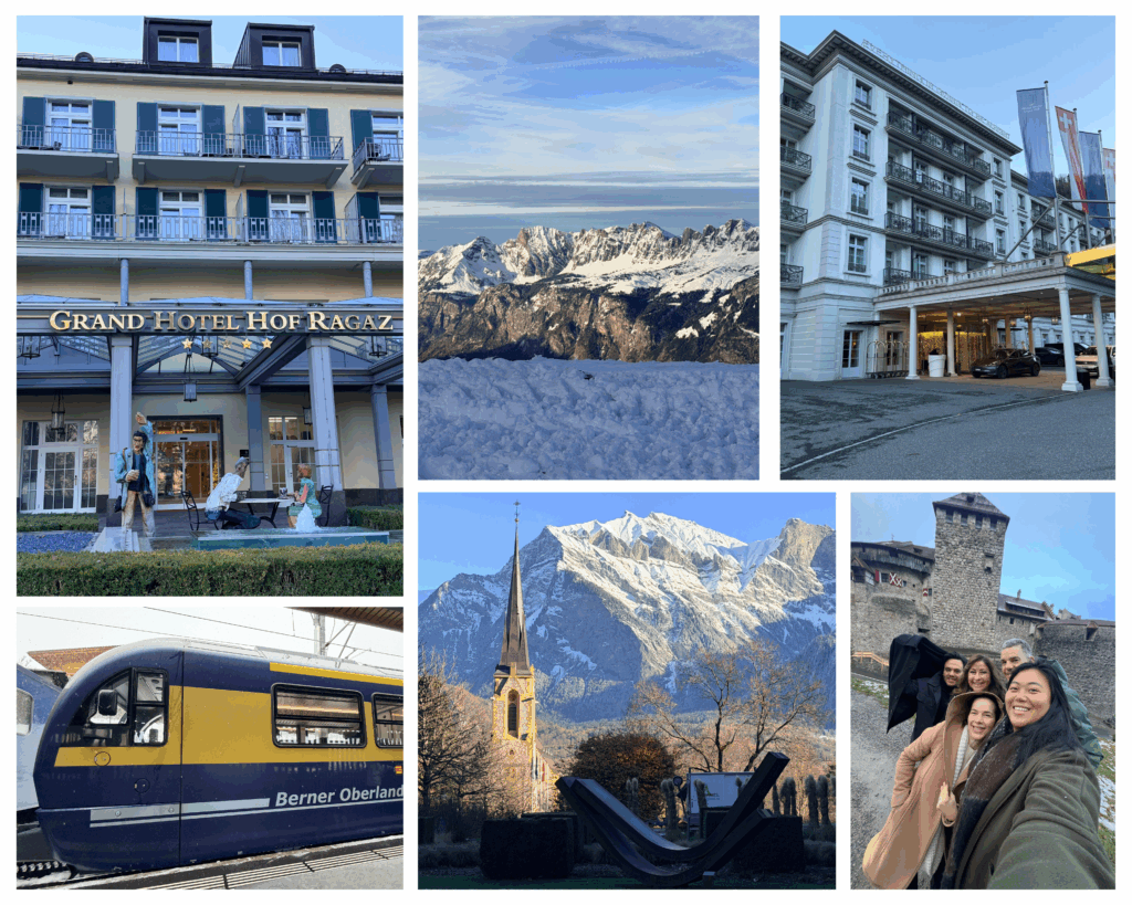 Our journey continued with a stop in Bad Ragaz, where we checked into the Grand Hotel Bad Ragaz, another spa icon. Thanksgiving there meant fondue and classic Swiss dishes, which somehow felt exactly right. A gondola ride up Mount Pizol rewarded us with sweeping 360-degree Alpine views.
