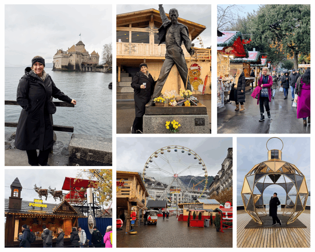 Next was Montreux, just as the Christmas Market lit up. Reflections danced on the lake, the air was spiced with mulled wine, and Chillon Castle rose from the water. By chance, it was the anniversary of Freddie Mercury’s death; flowers and handwritten notes gathered at his statue. Switzerland turns quiet moments into lasting memories.
